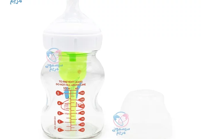 - سیستم ضدنفخ (آنتیکولیک): نی سبز رنگ تعبیهشده درون شیشه با جدا کردن هوا از مایع، مانع ورود هوا به معده نوزاد شده و از دلدرد و نفخ جلوگیری میکند؛