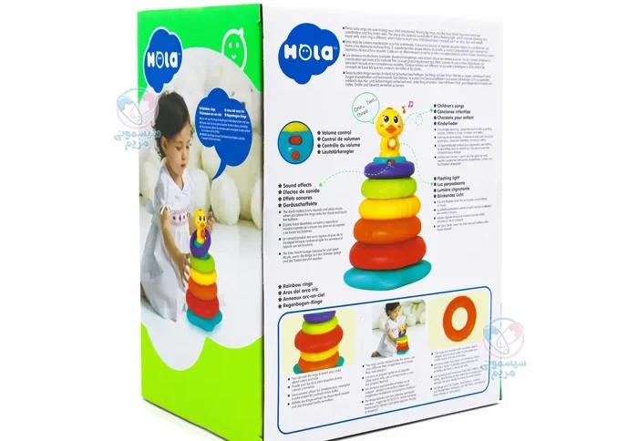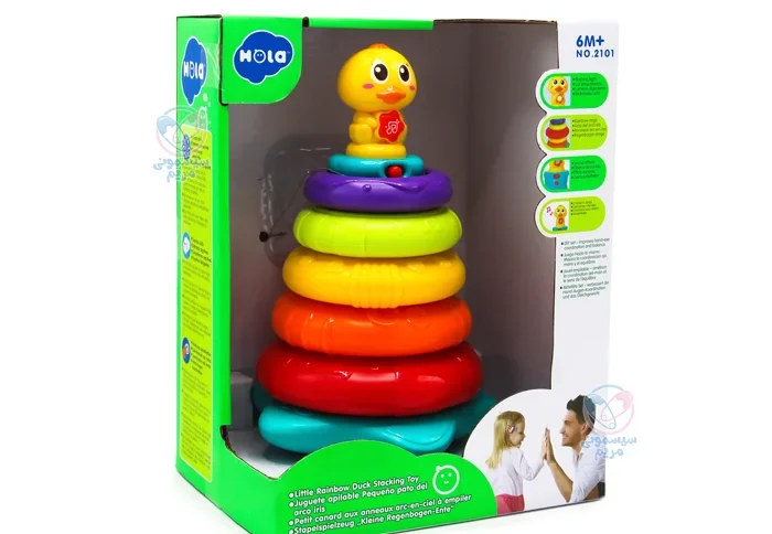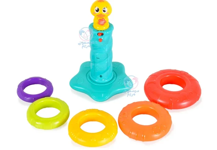 - دارای 5 حلقه رنگی با ابعاد مختلف است که به کودک امکان میدهد تا به سادگی آنها را روی پایه اردک قرار دهد. این حلقهها به تقویت مهارتهای حرکتی کمک میکنند؛