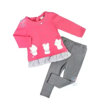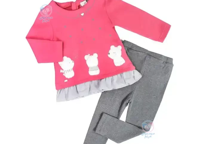 • این ست زیبا در دو رنگ طوسی و صورتی عرضه می‌شود. ترکیب این دو رنگ به خلق ظاهری دلنشین و جذاب کمک کرده و به‌راحتی با سایر لباس‌های کودک هماهنگ می‌شود؛