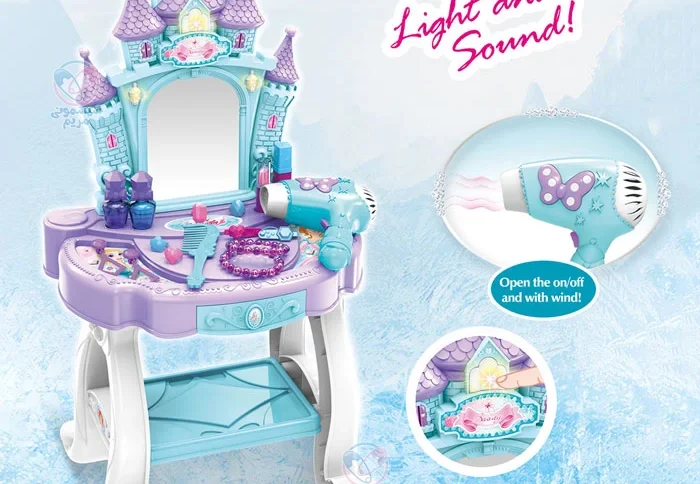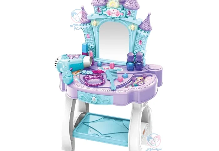 محصولی با میز آرایش آیینه‌دار، وسایل آرایش پلاستیکی (سشوار، شانه، برس، آیینه، ژر لب و …)، تهیه شده از پلاستیک درجه یک