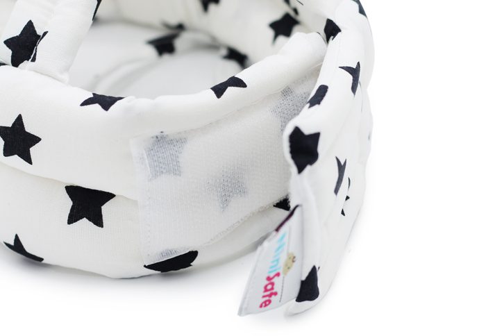 - با استفاده از چسبی که در قسمت پشت دارد، این کلاه روی سر کودک با اندازه سر او تنظیم میشود. دو بند در طرفین نیز برای استحکام بیشتر روی سر محکم میشوند؛