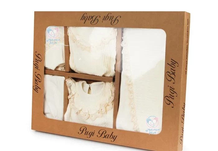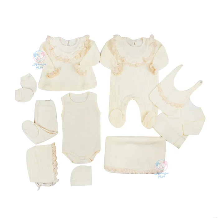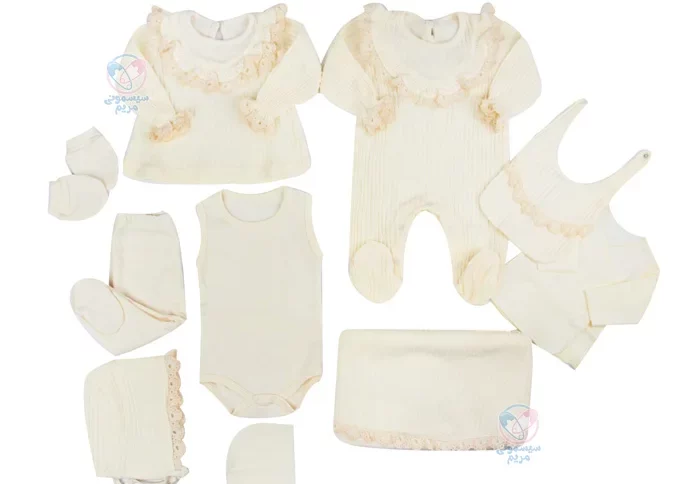 - شامل 10 تکه مختلف، مثل بادی آستین بلند، بلوز آستین بلند، پتو، پیشبند، دستکش، شلوار جورابدار، کلاه و مانتو است که نیازهای روزمره نوزاد را بهصورت کامل پوشش میدهد؛