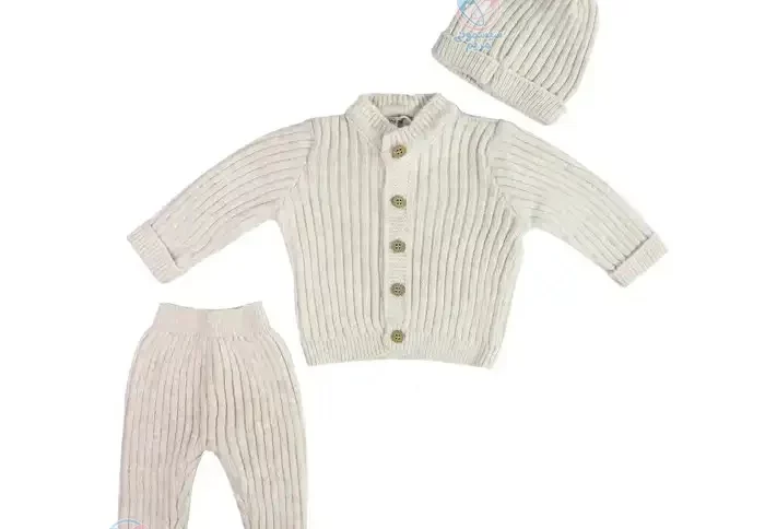 برند Wofim که مبدأ آن ترکیه است، با ارائه لباسهای باکیفیت و شیک، توانسته محبوبیت زیادی در میان والدین کسب کند. ست سهتیکه بافت، شامل یک کت جلو دکمه، یک کلاه و یک شلوار است که همگی از پارچه بسیار نرم و باکیفیت بافته شدهاند.