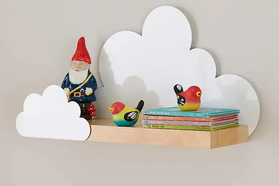 - قفسههای ابری شکل: این قفسهها شبیه به ابر هستند و هم داخل و هم روی آن میتوانید وسایل مختلفی قرار دهید. با تزیینکردن این قفسه همراه با ریسه نور، فضایی رویایی برای کودکتان ایجاد کنید.