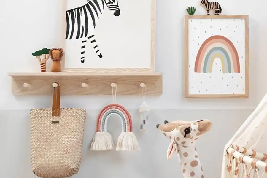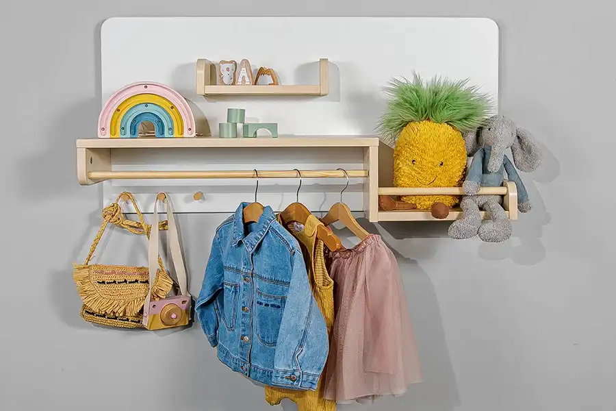 - شلف دیواری آویزدار: این قفسهها یکیدیگر از انواع شلف دیواری اتاق کودک به حساب میآیند که علاوه بر فضای بیشتری که برای قرارگرفتن وسایل مختلف مثل کتاب، اسباببازی و قاب عکس دارند، قابلیت آویزانکردن لباس، کیف سبک و وسایل دیگر را نیز دارند. با این قفسهها میتوانید مرتبکردن وسایل را به کودک خود آموزش دهید و از او بخواهید بعد از بازیکردن، وسایلش را در قفسه مربوط به خود مرتب کند.